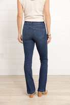Meet your new denim obsession. The Mac and Me Mid Rise Itty Bitty Bootcut jeans are where effortless style meets everyday comfort. Designed with a flattering mid-rise waist and a subtly flared leg, this silhouette elongates your figure while maintaining a modern, tailored feel. The itty bitty bootcut is just enough flare to fit over your favorite footwear—without overwhelming your shape.