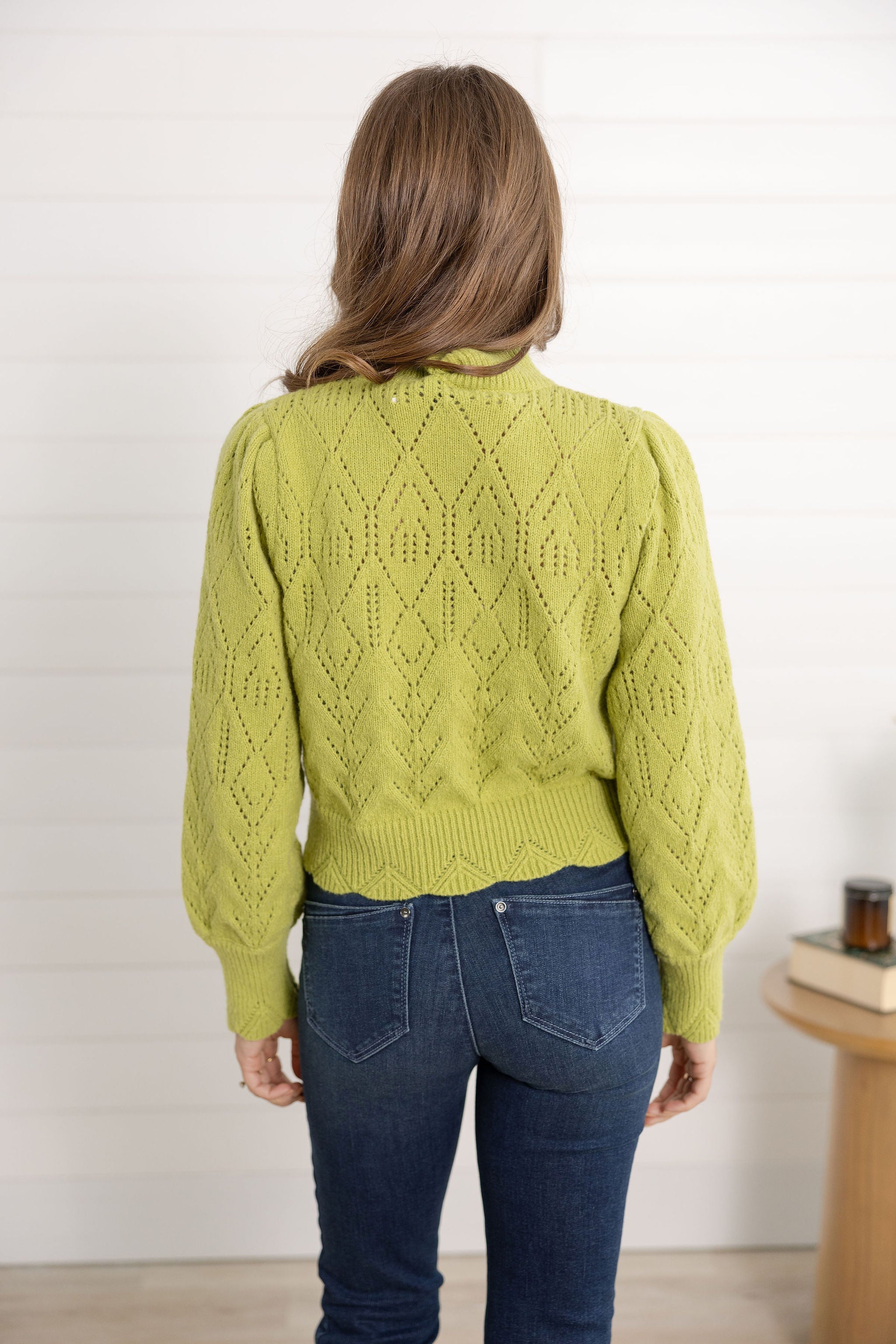 A soft pointelle sweater with delicate open-knit detailing. Lightweight and feminine, it’s perfect for layering or wearing on its own.