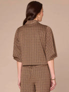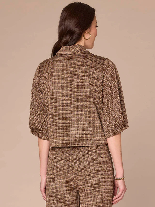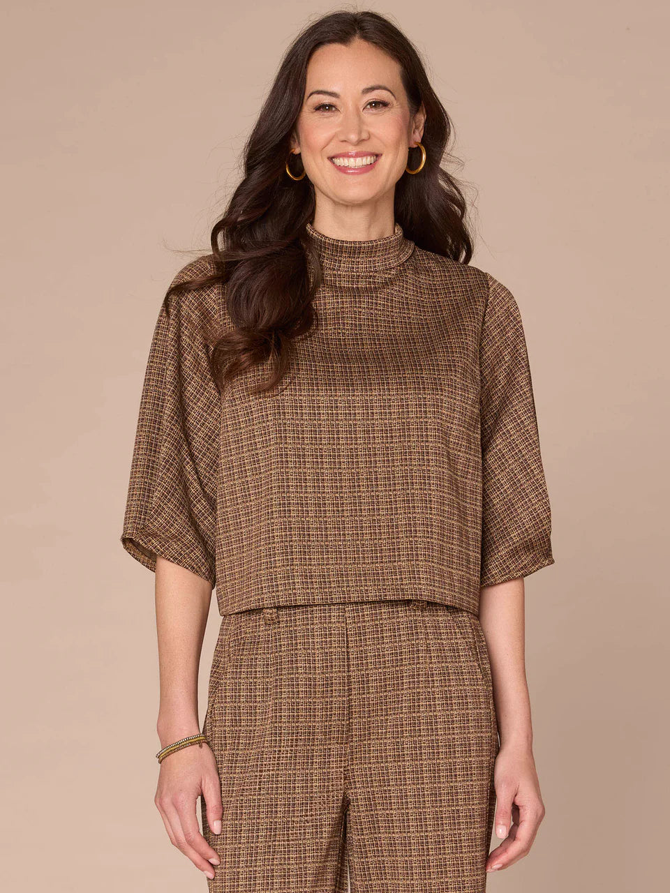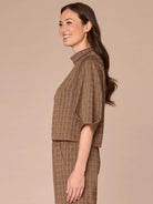 Soft, comfortable, and made for any type of day, this shorter knit top is sure to become a favorite in your rotation. It has elbow pleated sleeves, a mock neck, seaming details, and a shiny plaid design.