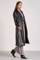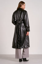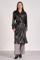 Make a bold statement in this sophisticated trench jacket, crafted from high-quality pleather for a luxurious look with animal-friendly appeal. A classic waist tie cinches your silhouette for a flattering and polished fit, while a smooth lining ensures comfortable wear. This versatile piece is perfect for layering over any outfit, adding instant edge and timeless style to your wardrobe.