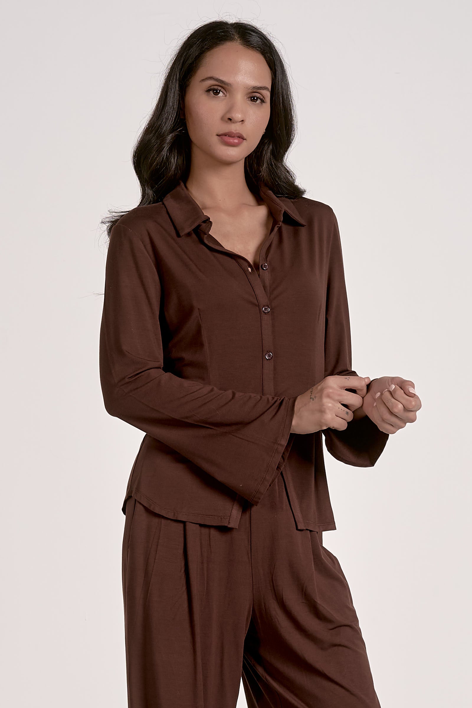 Expertly crafted from soft, lightweight fabric, this button-down top offers a relaxed fit and all-day comfort with a gracefully flowing drape. Subtle flare sleeves add a touch of modern femininity, creating a distinctive and stylish silhouette. This versatile piece can be dressed up with trousers or worn casually with jeans for an effortlessly chic look on any occasion.