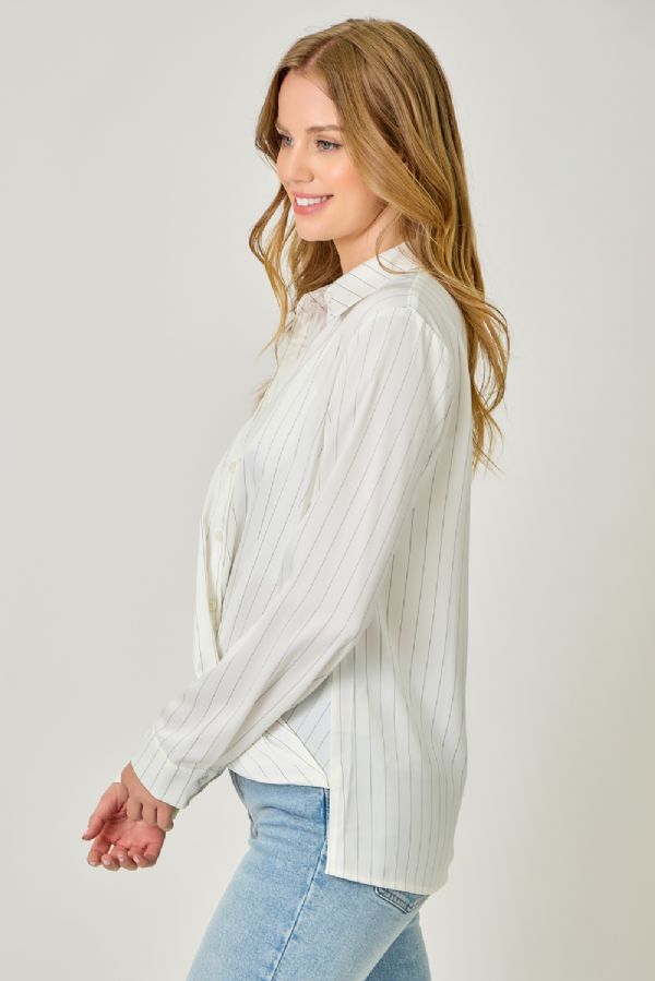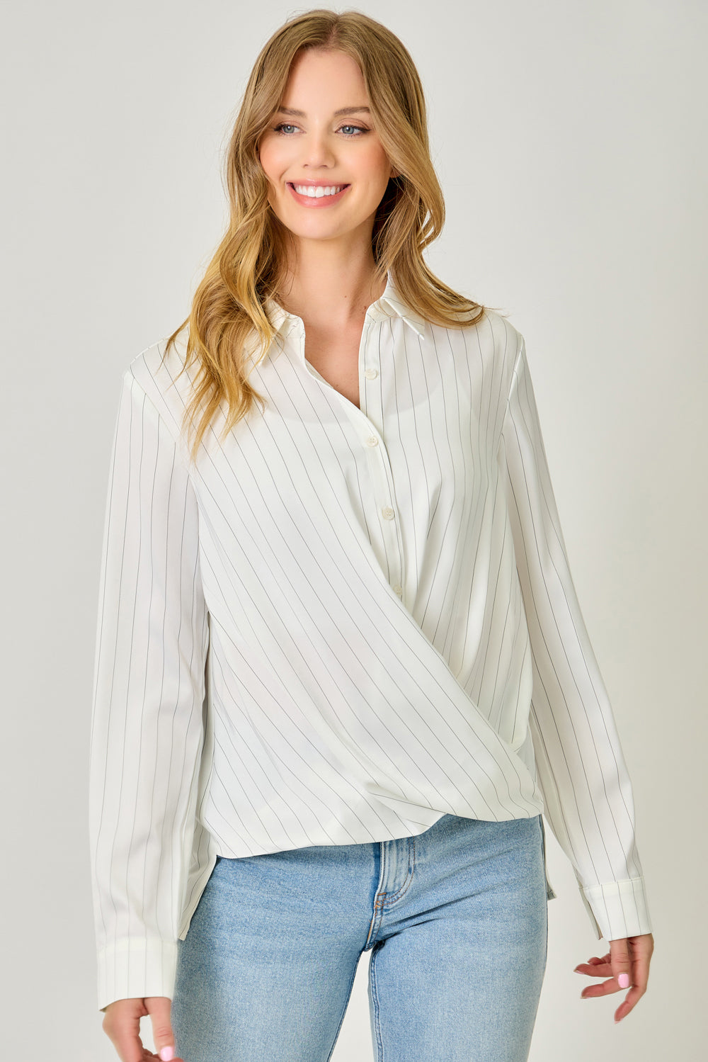 This striped button-down blouse features a modern twisted hem detail that adds subtle flair to a classic design. Its crisp fabric and tailored fit make it perfect for both professional and casual looks. Pair it with jeans or dress pants for effortless style.