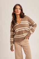 This soft and cozy oversized sweater features a timeless striped pattern, creating a classic and effortlessly stylish look for any casual occasion. The contemporary notch neckline adds a modern and flattering twist to the traditional silhouette, perfect for showcasing a layered top underneath. With its relaxed fit, this versatile sweater offers comfortable, all-day wear that can be easily paired with your favorite jeans, leggings, or skirts.