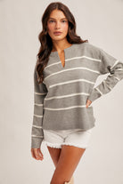 Classic stripes meet modern detail in this cozy-chic V-neck sweater. Designed with a relaxed fit and soft-touch knit, it features a flattering V neckline accented by functional button detailing for an elevated twist. Whether you're layering it over a collared shirt or styling it solo, this sweater brings effortless style to any outfit.