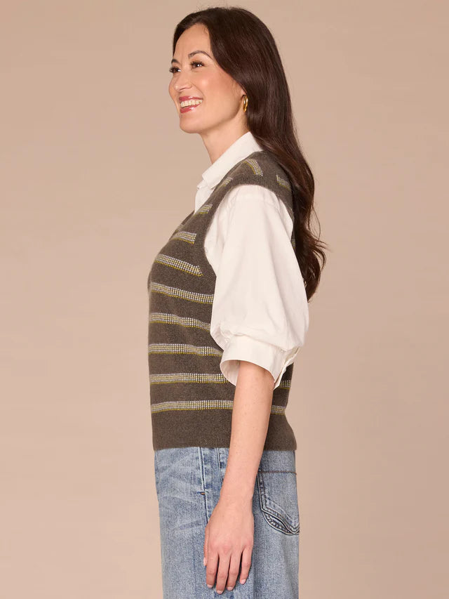 From polished office ensembles to comfy coffee dates, this twofer sweater does it all with ease. The one-and-done style is designed with below elbow blouson sleeves, a collar V-neck, and stripes on the sweater vest element.