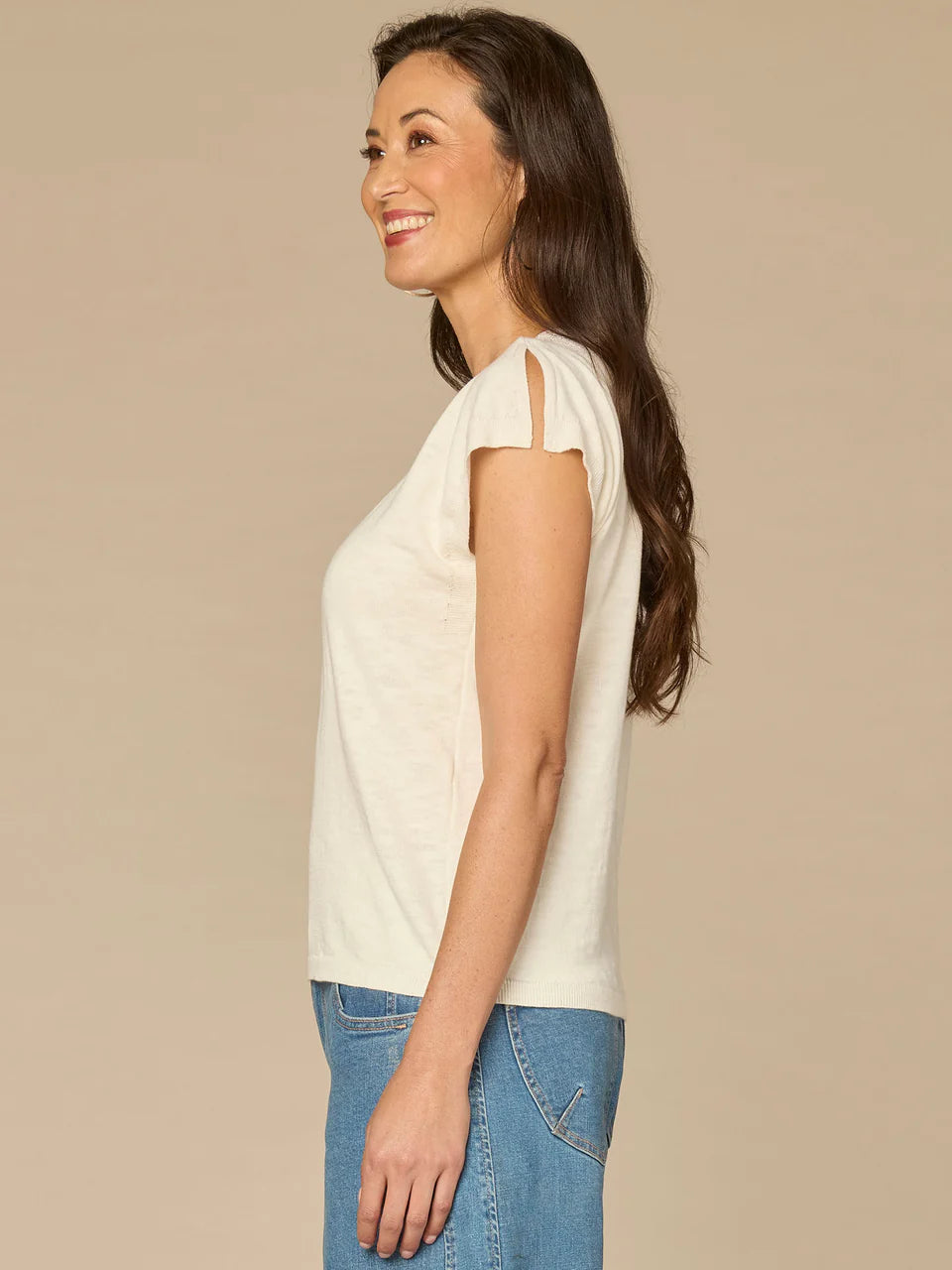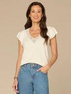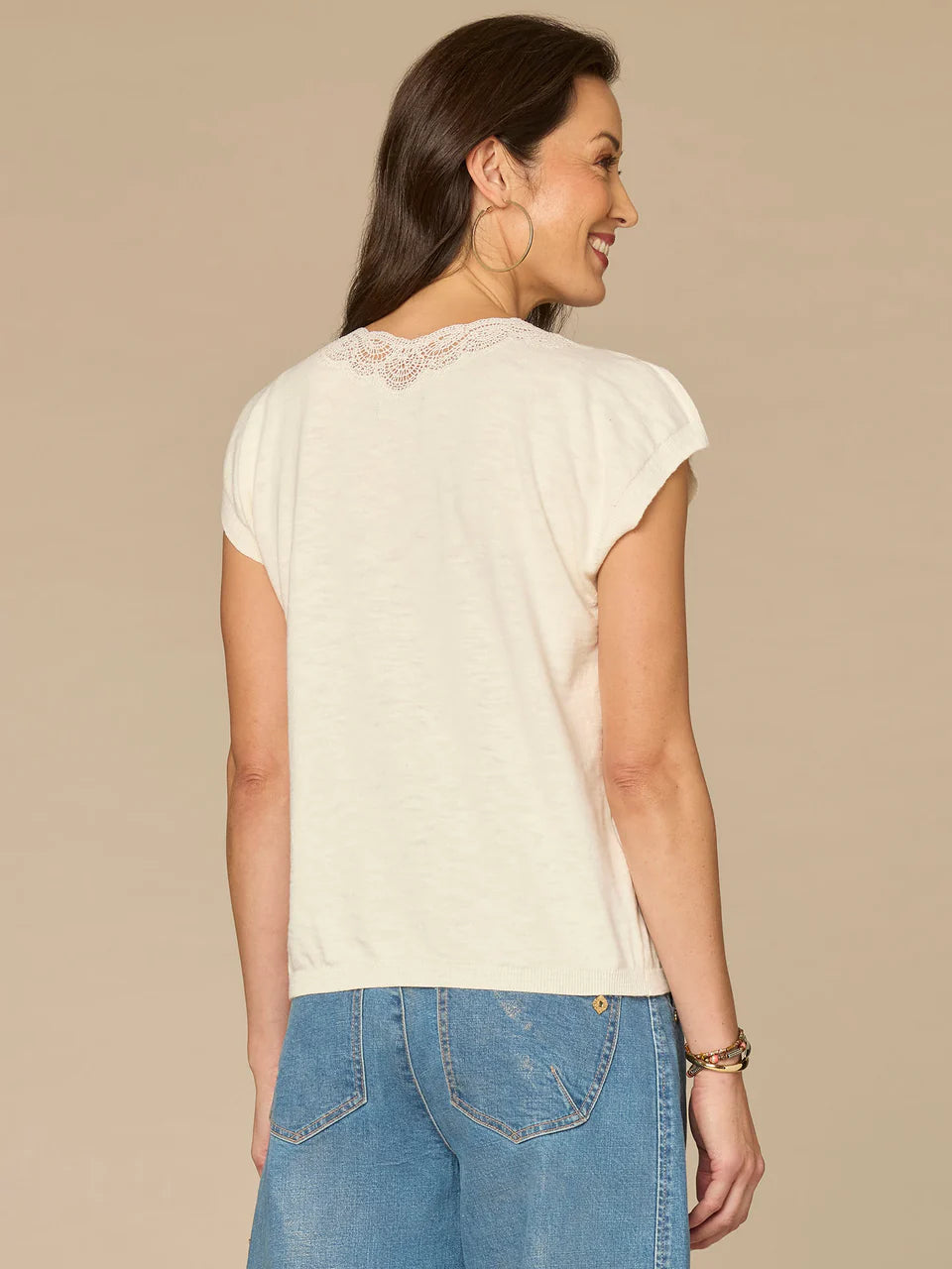 Pair this feminine sweater top with your favorite jeans for the perfect outfit. It has short split sleeves, an embroidered lace V-neck, and a banded hem for a flattering fit.