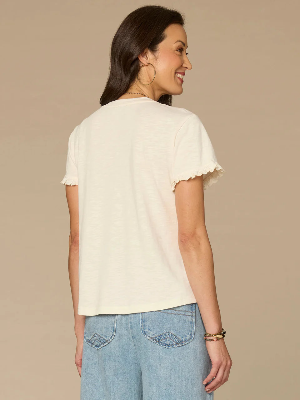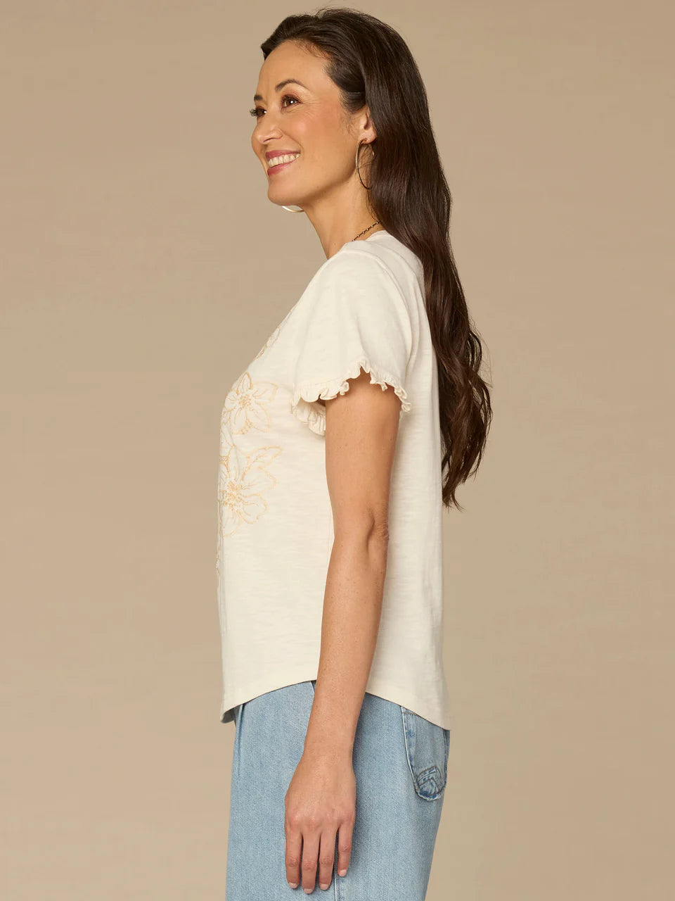 Cotton Short Ruffle Sleeve Crew Neck Floral Embroidered Knit Top