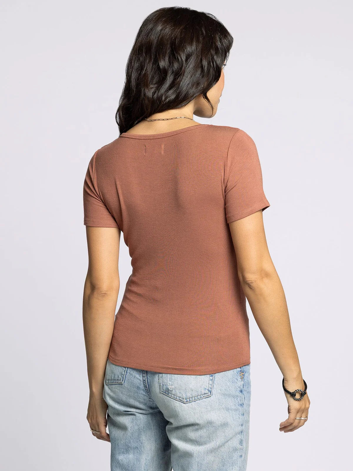 This fitted tee features a squared scoop neckline for a modern, flattering silhouette. Its sleek design makes it perfect for layering or wearing alone. Ideal for pairing with jeans, skirts, or shorts for a versatile everyday look.