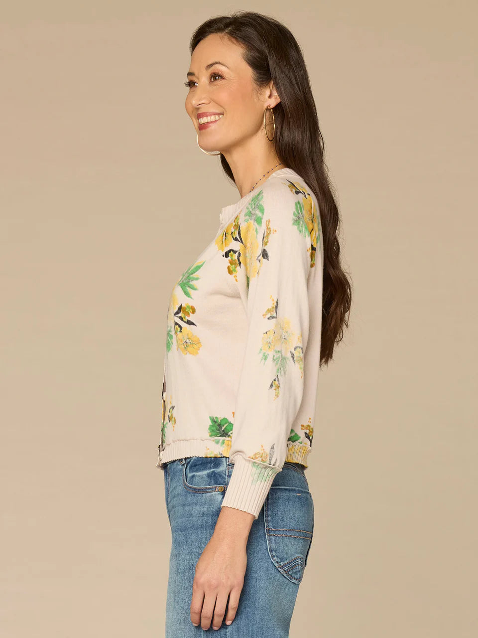Cotton 3/4 Sleeve Hidden Snap Printed Sweater Cardigan