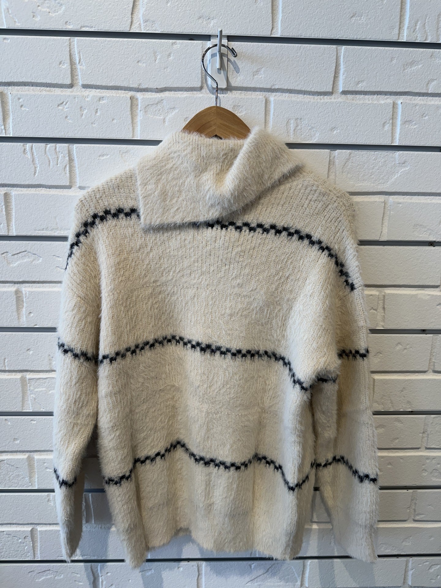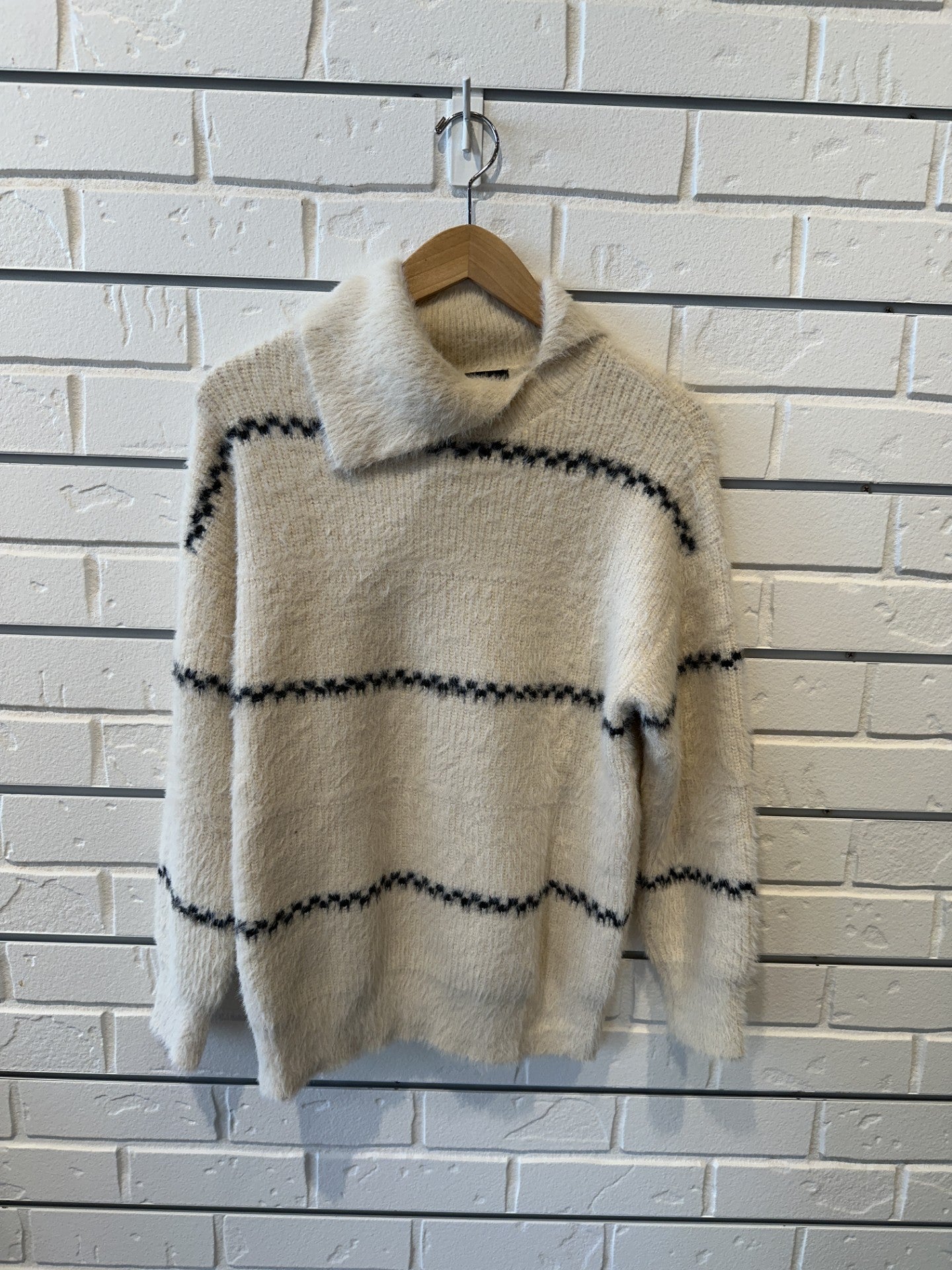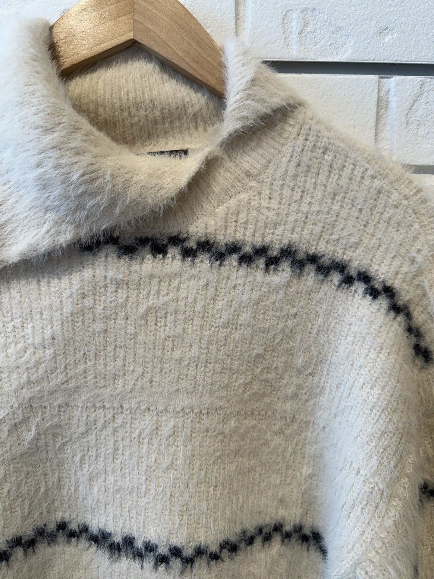 This luxuriously soft eyelash sweater features a delicate, textured knit that feels incredibly cozy against the skin. The eye-catching contrast stripe stitching adds a stylish detail, making this a chic and modern update to a classic knitwear silhouette. Perfect for dressing up or down, this versatile piece brings an effortless touch of charm and comfort to your everyday wardrobe.
