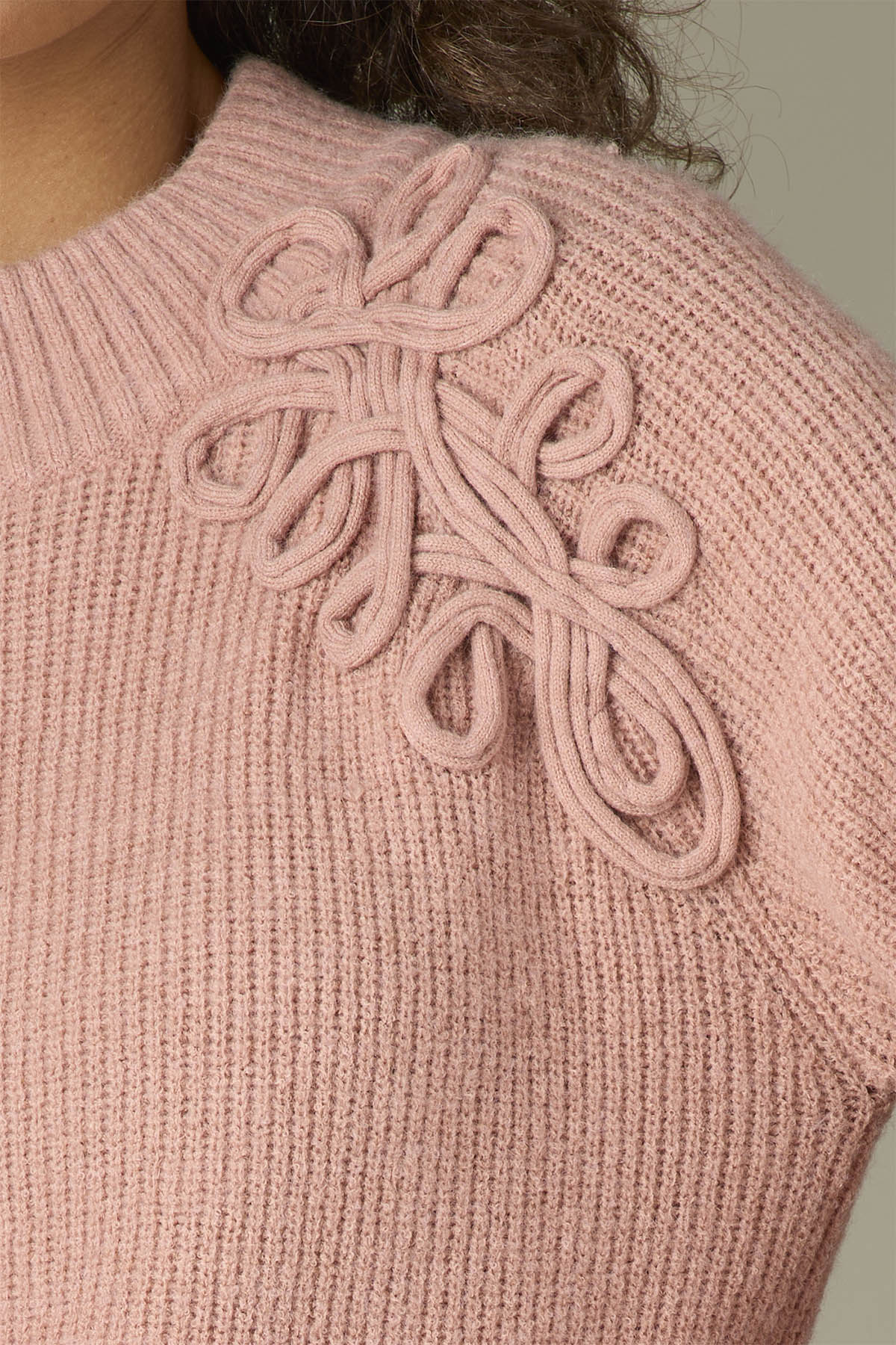 Pull this elevated sweater on and go. It has long raglan sleeves, a mock neck, modern soutache embroidery, and curled edges.