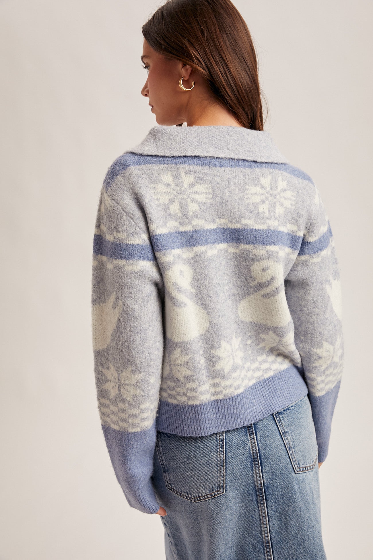 Cozy up in style with this elegant zip-front sweater, featuring a captivating swan motif that blends comfort with whimsical charm. Made from a soft, warm knit blend, this piece offers a relaxed fit and practical full zipper closure for effortless layering. The unique design and front pockets add a playful and functional touch, making it a distinctive addition to any casual wardrobe.