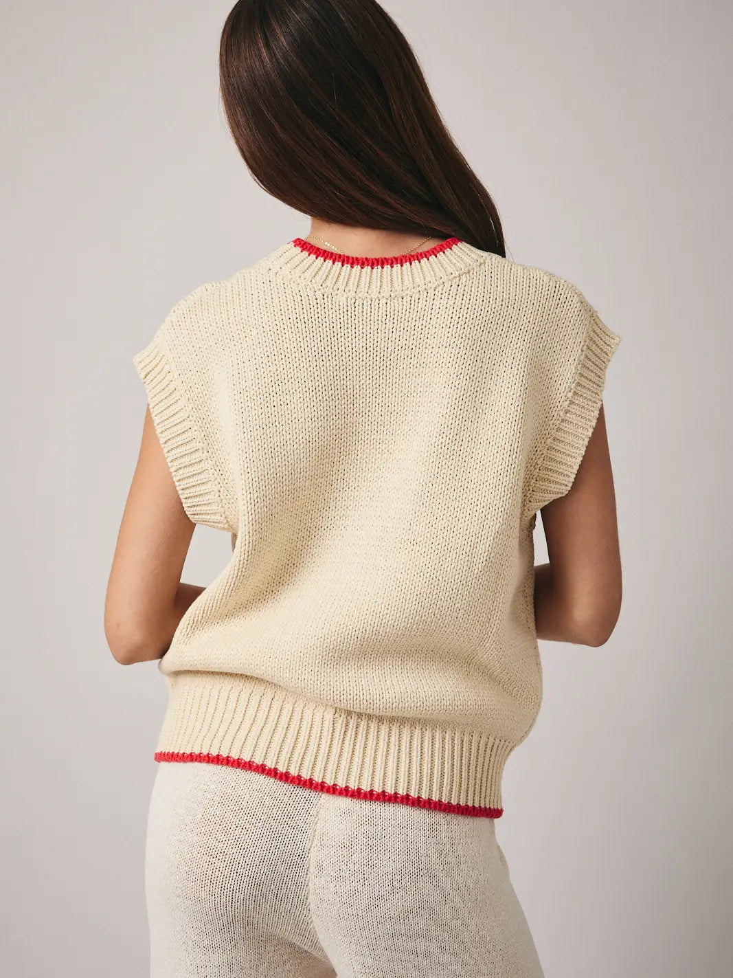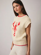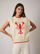 This wide high neck sleeveless sweater features a playful lobster motif for a fun, coastal-inspired look. Crafted from a soft, cozy knit, it offers a relaxed fit that layers easily or stands out on its own. Perfect for adding personality to your outfit, it pairs effortlessly with jeans, shorts, or tailored trousers.