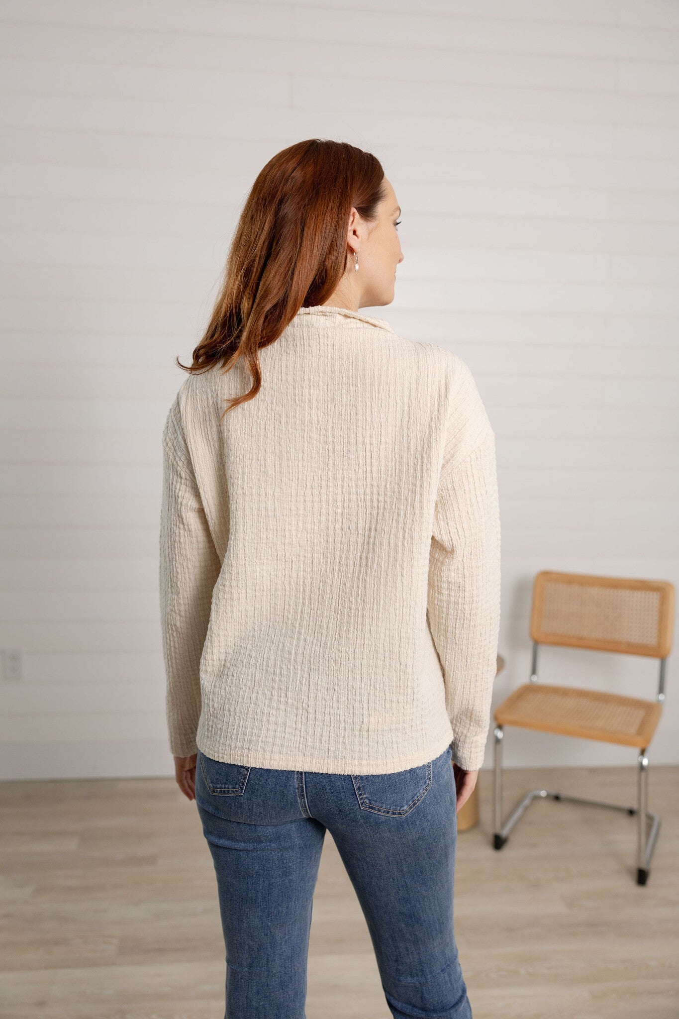 Elevate your everyday style with this textured top, a perfect blend of comfort and sophistication. The refined funnel neckline creates a polished, minimalist silhouette, while the soft, textured knit fabric adds a touch of modern dimension. Whether you wear it solo or as a chic layering piece, this top is an effortless essential for a timeless look.