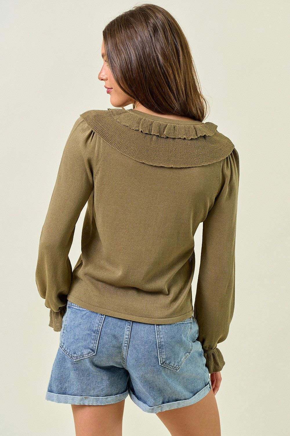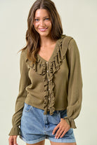 Crafted from a delicate, fine-gauge knit for a lightweight and comfortable fit, this button-front top is enhanced with stylish ruffle detailing along the collar, placket, and sleeve cuffs for a feminine touch. The contrast ruffle design adds depth and dimension to the overall look, while the versatile button-front closure allows for multiple styling options.