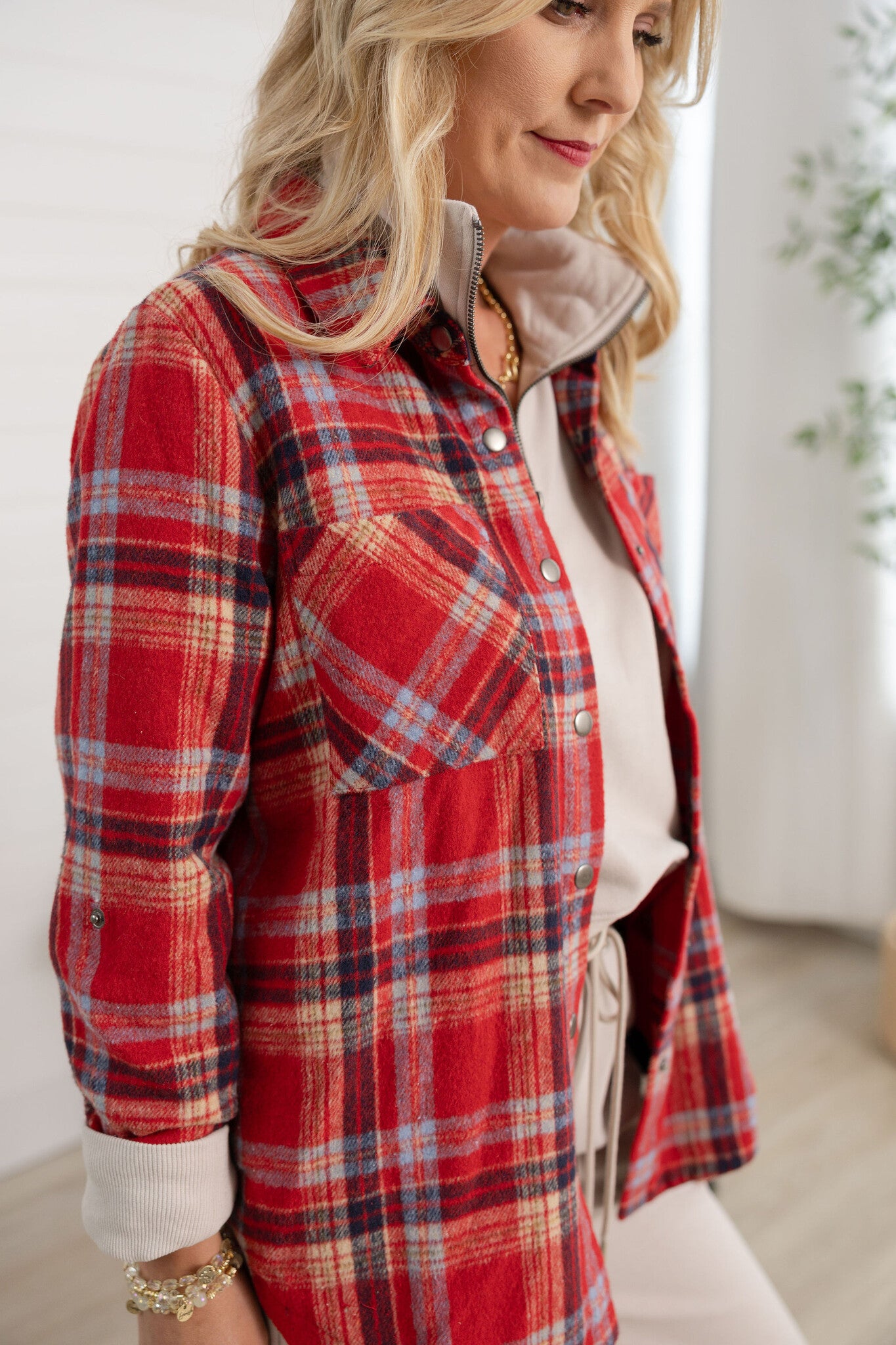 This snap front plaid long shirt jacket offers a perfect blend of classic pattern and functional design. Its relaxed fit and snap closures make layering effortless and stylish. Ideal for transitional weather, it pairs easily with jeans or leggings for a laid-back look.