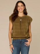 Soft, shiny, and made for all kinds of days, this is a must-have knit top for the season. It has extended cap sleeves, a smocked crew neck, cinched ruffle hem, and a striped foil bodre design.