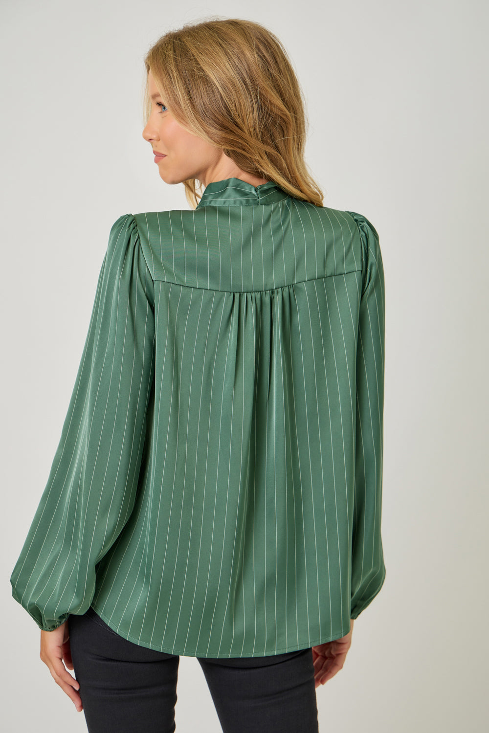 Effortlessly chic, this Ribbon Tie Stripe Shirt features a playful ribbon neckline detail and classic stripe pattern. The long bubble sleeves and hi-lo hem with side slits add flowy movement and modern flair. Designed in a loose fit for all-day comfort and easy styling.
